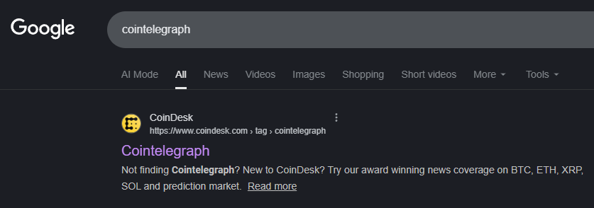 In October of 2025, Cointelegraph disappeared from Google results.